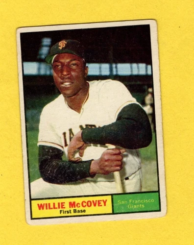 The 1961 Topps Willie McCovey card #517 features a vibrant color photo of McCovey in a batting pose. Key features include the classic Topps 1961 design with a bright yellow background and the player's name and team in bold at the bottom. The back of the card provides stats and trivia about McCovey, typical of Topps cards from this era.How does card condition affect its collectibility?